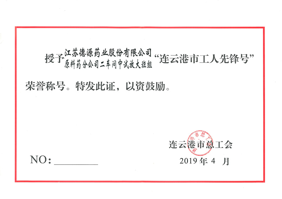 原料藥分公司二車間中試放大班組榮獲2019年“連云港市工人先鋒號”榮譽(yù)稱號