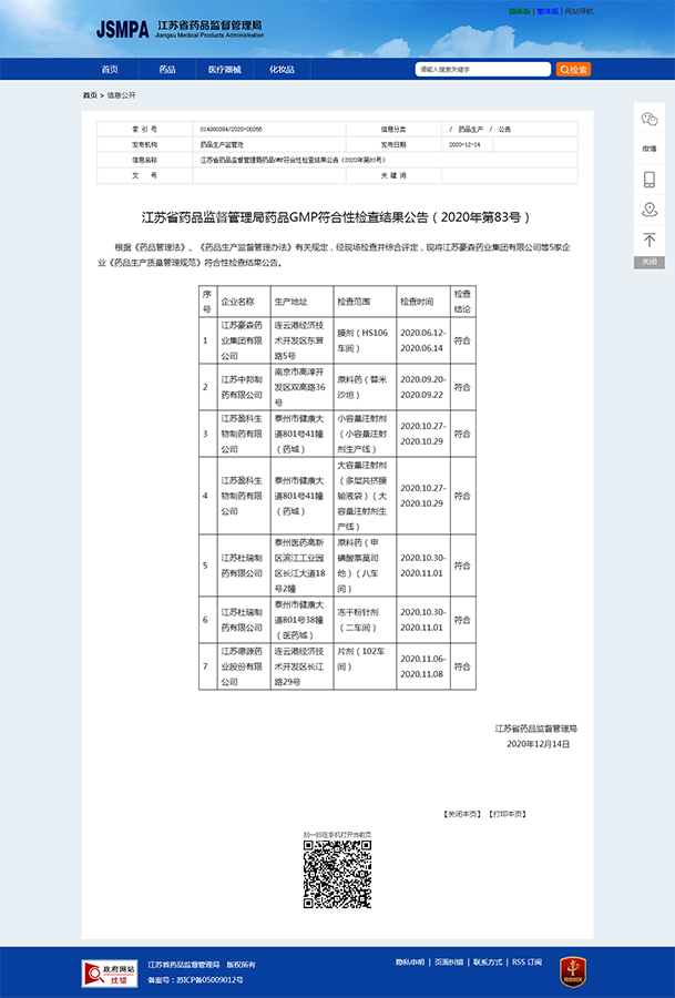 我公司片劑(102車間)經(jīng)現(xiàn)場檢查和綜合評定,檢查結論符合《藥品生產(chǎn)質(zhì)量管理規(guī)范》。近日,江蘇省藥品監(jiān)督管理局公告了檢查結果(2020年第83號)。